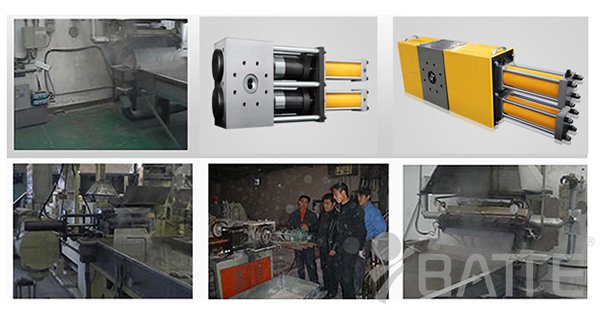(2)小型的拉條冷切造粒工藝一般都用多網(wǎng)往復過濾的換網(wǎng)器(如:可采用雙柱四工位液壓換網(wǎng)器、雙柱四工位反沖洗液壓換網(wǎng)器),因為它帶穩(wěn)壓及自動排氣機構,換網(wǎng)時不停機、不斷條、不影響正常生產(chǎn),粒子光滑無氣泡。口模與換網(wǎng)器一體化設計制造,合理、經(jīng)濟、實惠!